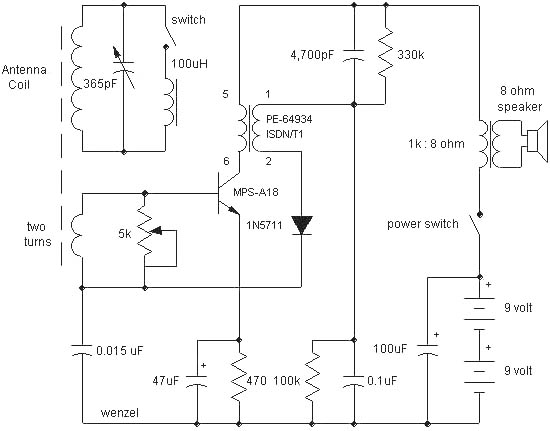 die Schaltung ist offenbar ein kleiner Reflex-Empfänger. HF- und NF-Verstärkung werden vom Transistor wahrgenommen, die Diode 1N5711 am aperiodischen HF-Trafo in dessen Collectorkreis übernimmt die Demodulation des AM-Signals. Etwas nachdenklich betrachte ich die Schaltungsvariante um den 5-kOhm Steller, der wohl der Rückkopplungseinstellung dienen soll. Das könnte bei nicht optimalen Aufbauten schon problematisch werden, denke ich. Aber vielleicht zerstreust Du mit ein paar Worten meine Bedenken.