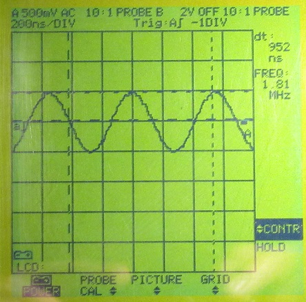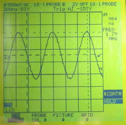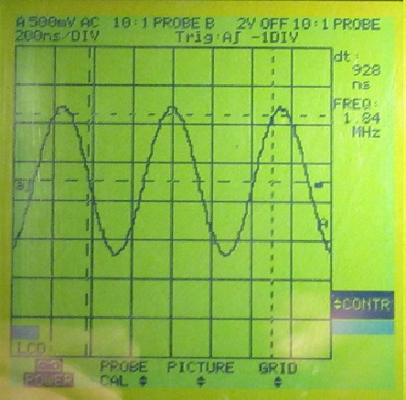 3. Messung der Resonanzüberhöhung im Variometer- / Fritterkreis. Fritter nicht eingesetzt....also unbelastet. Resonanzspannung im Kreis = 1.7Vss ca. 1 : 3,4 bei 1.84MHz