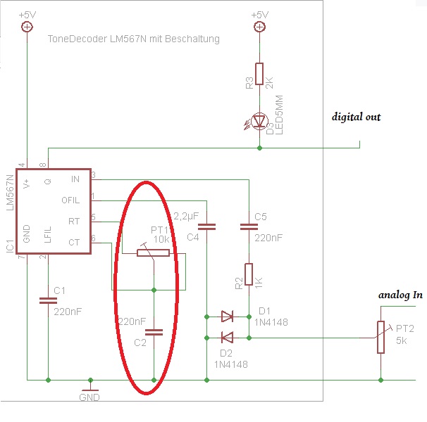 jetzt habe ich die Zeit, den Tondecoder für meinen Kammerton-Indikator in Angriff zu nehmen. Besten Dank für die Begrenzungsschaltung der Eingangsspannung! Ich habe im Internet ein kleines Rechenprogramm für den NE567 gefunden. Wenn man die kritischen Werte für den Widerstand und den Kondensator an Pin 5 und 6 sowie den Wert des Kondensators an Pin 2 eingibt, bekommt man die Frequenz und die Bandbreite angezeigt. Wenn ich meine 440 Hz sehr trennscharf haben will, muß ich den Kondensator an Pin 2 (in Deinem Bild heißt er C1) mindestens 220 Mikrofarad groß machen, dann bekomme ich etwa 1,54 % Bandbreite. Mit 470 Mikrofarad bekomme ich 1,052 % von 440 heraus, das sind 4,63 Hz. Das wird für mich der beste Wert sein.