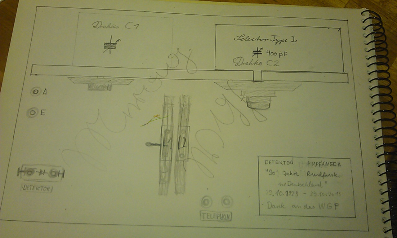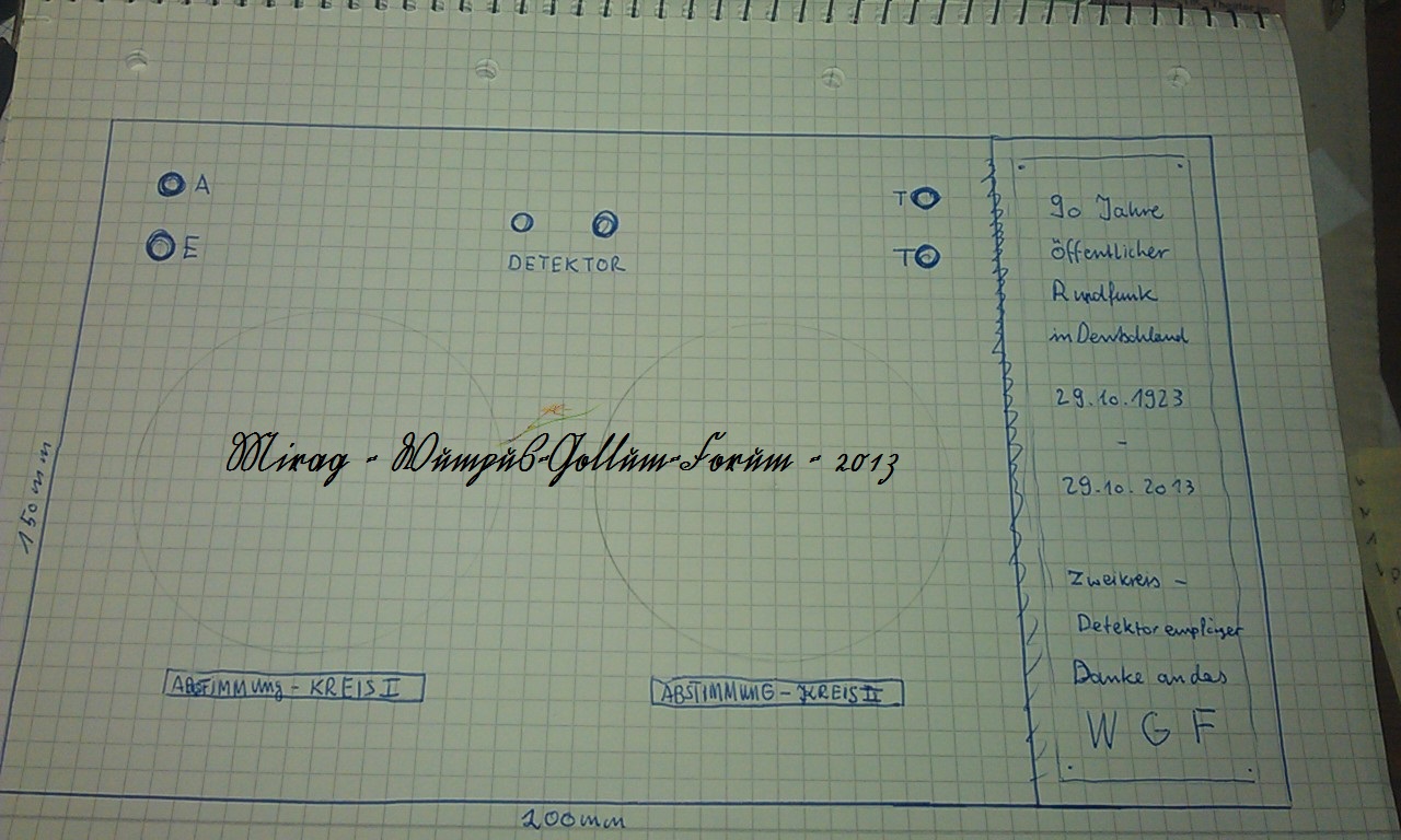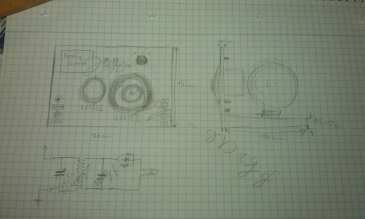 Auf der Montageplatte wären dann ganz vorn die Buchsen A / E ; Telefon. Dann die Drehkoknöpfe Antennenkreis, Detektorkreis. Hinten mittig der Spulenkoppler. Falls Du noch einen Kristalldetektor einsetzten willst, sollte der auch mehr mittig im Vordergrund sein.