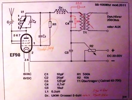 Die Schaltung findest Du hier im Forum. Suche: "Elementare Radioschaltungen FM Pendelempfänger" Ich betreibe die Schaltung mit 12V und es funktioniert gut. Die 2SH27L eignet sich auch für 12V Anodenspannung und macht 120MHz, ich denke es klappt. (Da teste ich gleich mal ein paar Röhrentypen...)