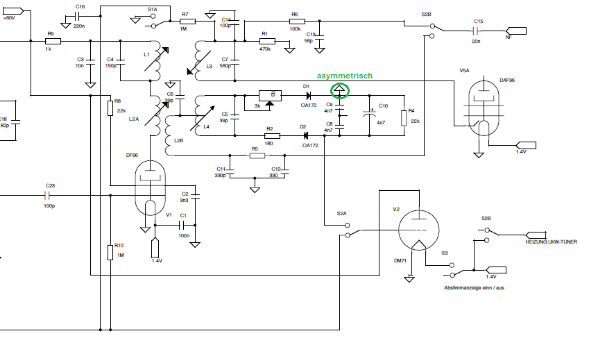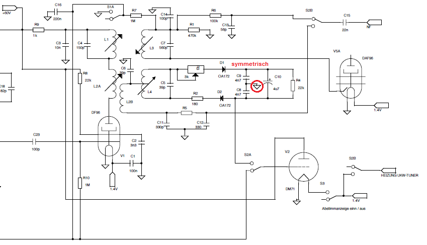 das ist eine etwas spezielle Beschaltung des Primärkreises, C6 ist der Schwingkreiskondensator für den Primärkreis, also L2A. Diese Schaltung ist nicht von mir, das ZF-Filter samt Ratiodetektor habe ich aus dem Grundig HF10-"Bauteilspender" ausgebaut. Vermutlich war die Idee, auf diese Weise die Streuinduktivität zwischen L2A und L2B zu kompensieren. Normal wäre ein Schwingkreiskondensator parallel zu L2A. Hier gibt es eventuell noch Optimierungspotential zwecks Erhöhung der NF-Spannung, z.B. durch Erhöhen der Windungszahl von L2B (und damit auch Verkleinern von C6). Für die NF-Problematik ist mir noch eine andere Idee gekommen, die leicht umsetzbar ist, falls sie funktioniert. Die DM71 zusätzlich als NF-Vorstufe für FM verwenden. Die Steilheit beträgt etwa 25uA/V im relevanten Betriebsbereich, das ergibt eine Verstärkung von etwa 5..6 bei 330kOhm Arbeitswiderstand. Der Gleichspannungsabfall kann einfach kompensiert werden, indem man den Widerstand an 90V statt 60V anschliesst, dann hat die Anode je nach Leuchtbandlänge eine Spannung von 60..80V. Schon fast wie in den 30er-Jahren mit der EFM11...