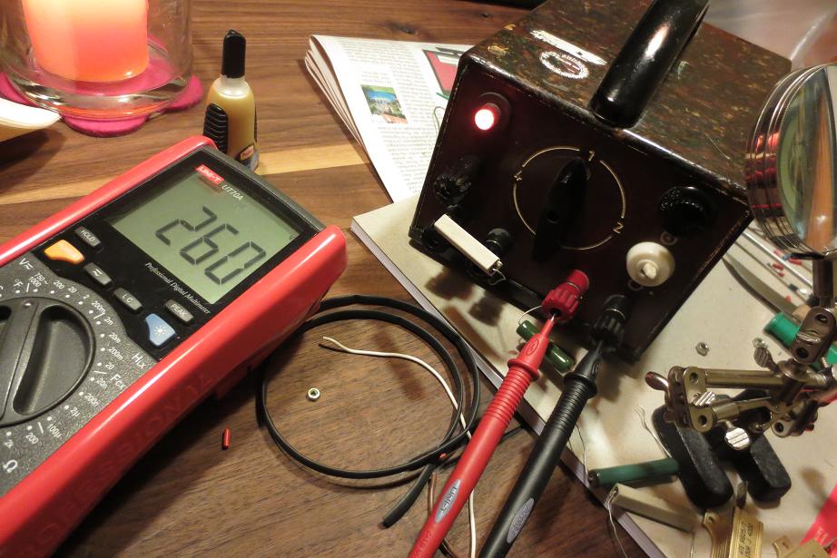 Anodenspannung 18VDC, 30VDC, 130VDC, 260VDC Stufe 4-1 mit 3,9k Last. AC mit Multimeter <1mV/ Messung mit Oszi noch offen. Mit 15k Last bis 330VDC. (U_Dach)