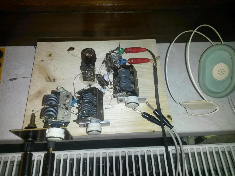 der Umbau ist somit fortgeschritten dass ich die ersten Empfangsversuche durchführen kann. Alle 3 Drehko's sind in der unteren Ebene angeordnet um nach oben kurze Verbindungen zu den Spulen zu realisieren. Die zwei Spulen der Kreise sind über Telefonbuchsen mit dem Drehko verbunden. Über zwei weitere Telefonbuchsen können die Kreise bei Bedarf einfach kapazitiv gekoppelt werden. Über die Diode (2 Telefonbuchsen) geht es direkt zum Ausgang bzw zur externen Kopfhöreranpassung. Die Kopfhöreranpassung (2 Pikatron 80 C 786 in Reihe mit 100000 Ohm zu 400 Ohm.) sind im schwarzen Kasten hinter dem Detektor angesteckt. Der Kopfhörer ist ein englischer DLR Nr. 5 sound powered Kopfhörer.