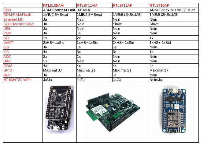 von der Firma Realtek gibt es interessante Wifi-SoCs die als Alternative zu den Chips von Expressif herhalten können. Preislich sind sie in der gleichen Region wie der ESP8266 und ESP32 anzufinden. Typische Devboards findet man unter den Suchbegriffen RTLduino und Ameba Arduino. Die Programmierung erfolgt auch hier mit dem gcc unter den bekannten Oberflächen wie Eclipse und Arduino IDE.