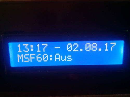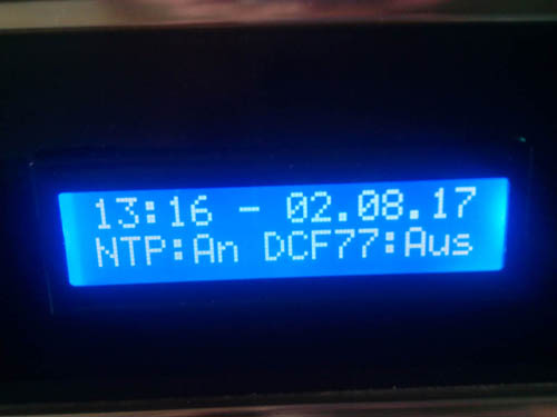 Zusätzlich habe ich eine Syncronisation der Prozessoruhr über drei Möglichkeiten implementiert. Primär erfolgt die Syncronisation über das Network-Time-Protokoll (kurz NTP) mit einem Zeitserver aus dem Internet. Ist dieser nicht erreichbar wird gewartet ob ein DCF77 oder MSF60 Signal am Prozessor anliegt. Danach erfolgt die Zeiteinstellung über diese Langwellensender. Für DCF77 habe ich ein fertiges Modul benutzt, das MSF60 Signal speise ich noch so (über ein Weltempfänger) ein bis ich ein passendes Empfangsmodul bekommen habe.