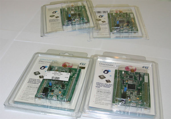 STMicroelectronic liefert für die DSP-"Fetischisten" unter Uns die Boards auch gleich mit allen nötigem Zubehör aus. Neben dem Hauptprozessor mit 168 oder 216 MHz-Taktfrequenz, 1MB-Flashspeicher und 192 oder 320 kB RAM, sowie 2.4 MSPS schnellen Analog-Digitalwandlern, zwei 12-Bit DACs, gibt es dort den CS43L22 Audio-DAC mit Klasse D-Verstärker und 0.8 Watt Ausgangsleistung. Zusätzlich ein "Digital"-Mikrofon mit PDM-Ausgang und weitere Spielereien wie 3-Achsen Gyroskop, 3D-Beschleunigungsmesser, 3-fach Magnetfeldsensor usw. Der Programmieradapter (ST-Link) mit Debugging-Fähigkeiten ist natürlich auch mit auf dem Board. Alles zum Preis eines Arduino MEGA-Boards.