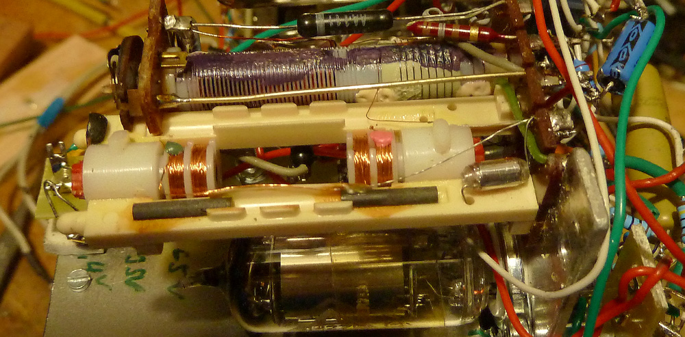 Im Vordergrund das AM-Bandfilter (mit den Spulen mit 2 Kammern) und im Hintergrund das FM-Filter mit dem Ratiodetektor, links die symmetrische Sekundärseite und rechts die Koppelspule, darunter unsichtbar die Primärspule. In freier Verdrahtung sind die Bauteile für den Ratiodetektor mit Ausnahme des Elkos.