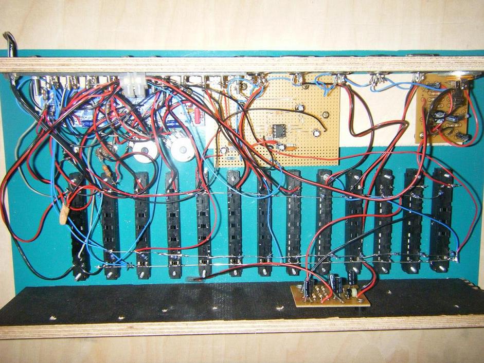 dann ist das Mischpult ja fast fertig. Ich hätte aber doch versucht, die Pegelmesser direkt einzubauen. Die große Platine in der Mitte der Anschlußseite läßt sich sicher auch anders platzieren. So hättest Du doch über den Schiebereglern Platz. Dann nur noch die Knöpfe in der vorhandenen Art vervollständigen.