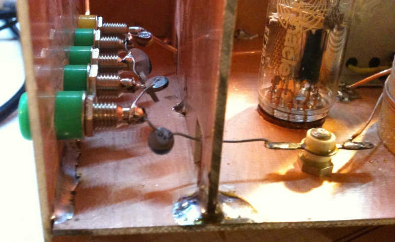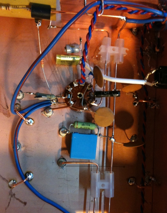 Die Audionstufe aus Richtung der Vorstufe gesehen. Das blau-rote Massekabel und die verdrillten Drähte für die Heizung führen nach "oben" über die anderen Bauteile. Oben links das Wendelpoti für die Rückkopplung.