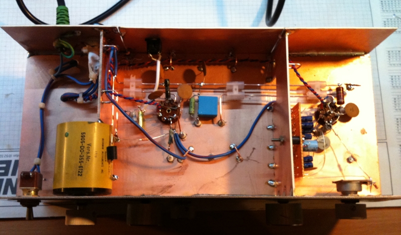 Ansicht von oben: Links die Vorstufe, dahinter die Antenneneinspeisung, rechts daneben die Audionstufe und gaz rechts das Netzteil.