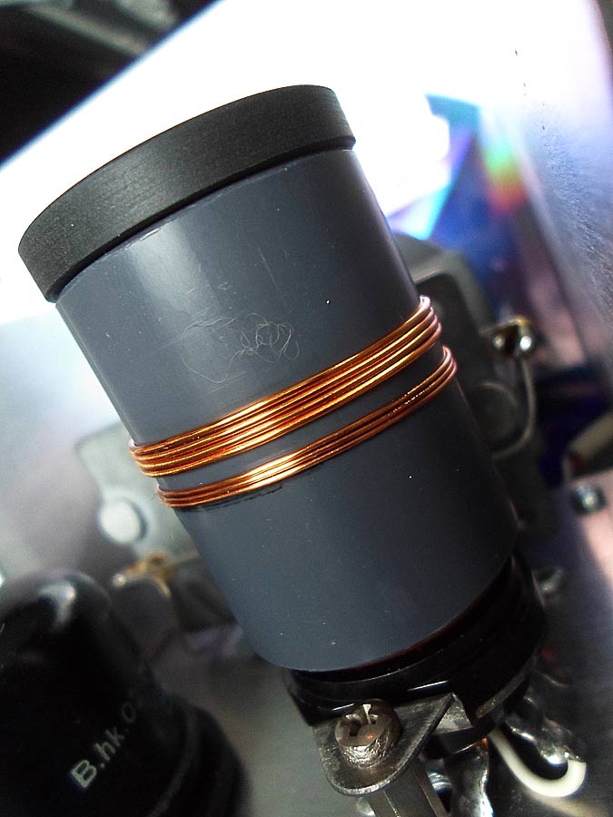 Mit vorgeplante Wellenbereich, hat das auch geklappt. Die gesamte Kapazität bei dem Eingagskreis liegt, nach Ausmessung bei 160 - 430 pF. Das ist grade das, was man baucht, Überdeckung - 2,7. Wellenbereich habe ich beschränkt auf 8,5 - 14 mHz. Bei einem L=0,8µH (Spule) hat sich, nach Ausrechnung, die Zahl von Windungen ergeben. Das waren 3,6 Windungen. Die Spule hat Durchmesser von 33mm. und Draht 0,8mm. Hat alles wunderbar geklappt. Das Radio war in richtigem Bereich.