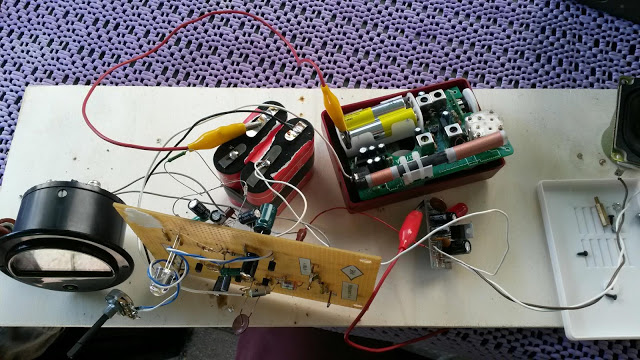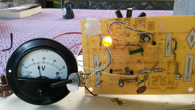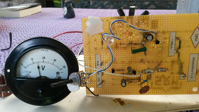 Hallo Freunde, kleines Update für den Blitzdetektor. Als Empfänger werkelt jetzt mal probehalber mein 2P3 Superhetbausatz. Die Blitzdetektorplatine ist jetzt auf NF umgestrickt, die LED Bernsteinfarben. Als Anzeigeinstrument ist jetzt ein 1,2mA Meter eingebaut - die Schaltung habe ich ein wenig angepasst.