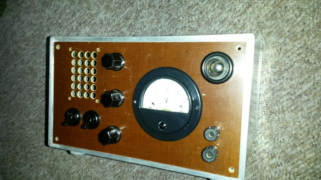Hier ist mal alles zusammengestellt. Das Lochgitter für den Lautsprecher. Darunter An/Aus schalter fürs gerät und die Beleuchtung des Instruments. Drehregler für Empfindlichkeit, Lautstärke und Anzeigebereich des Instruments. Die Signallampe ist auch mal noch eine Größere geworden. Da kommt dann die Bernstein-LED rein - die sieht bisschen aus wie so ne NE Glimmlampe. Darinter dann Antennen- und Erdbuchse.