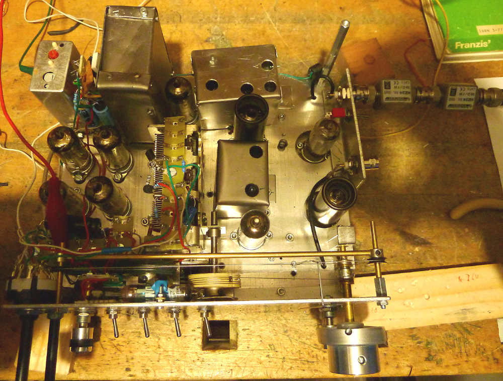Von oben: Die ZF-Filter haben jetzt alle eine Abschirmung bekommen. Vorne rechts sieht man noch den Doppel-Drehknopf für die getrennte AM/FM-Abstimmung. Der hintere musste etwas modifiziert werden, damit das Ganze nicht zu lang wird.