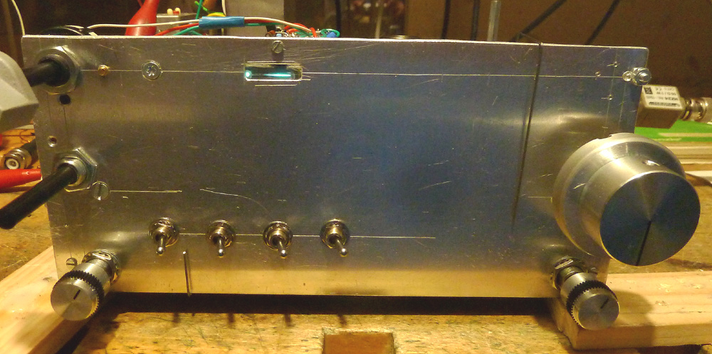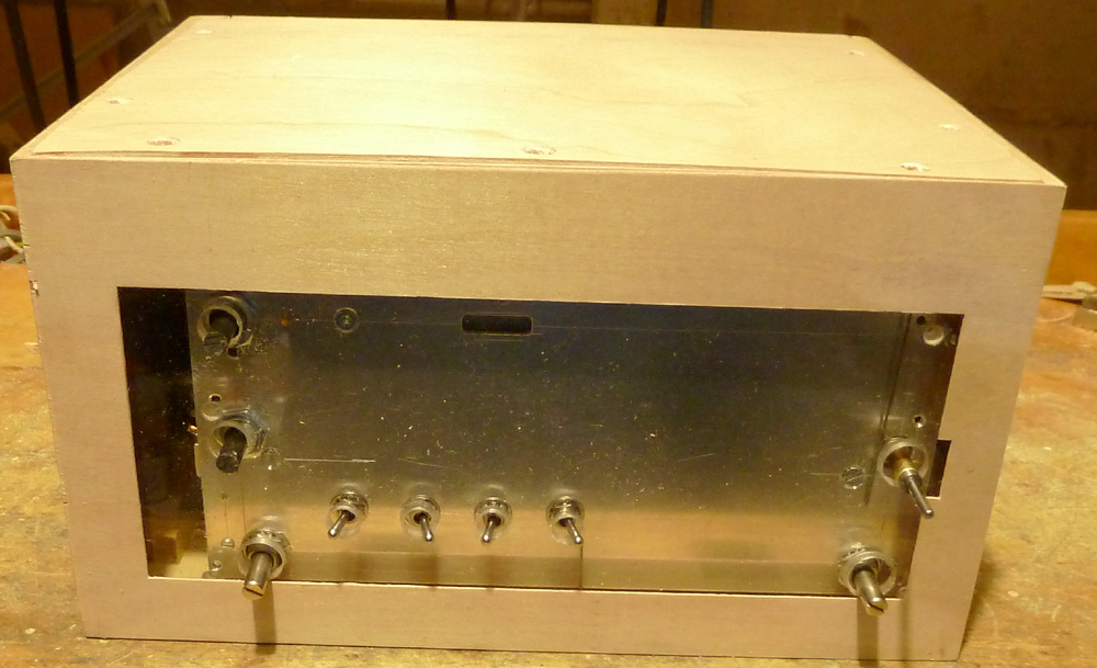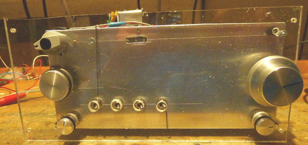 Hier noch von vorne in Aktion. Die beiden Skalenzeiger lackiere ich eventuell noch rot, das war ja die Standardfarbe. Da auf die Aluplatte aber eine weisses Papier mit den Beschriftungen kommt, sieht man sie auch so gut. Die 4 Kippschalter sind der Ein-/Aus-Schalter, die Abschaltung der DM71, die Umschaltung Eintakt/Gegentakt und die Leistungsreduktion im Gegentaktbetrieb. Der Drehschalter links oben ist der Wellenschalter, und die beiden kleinen Drehknöpfe sind für die Höhen- und Bassregelung.