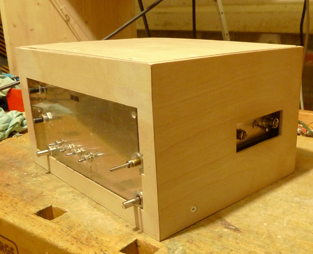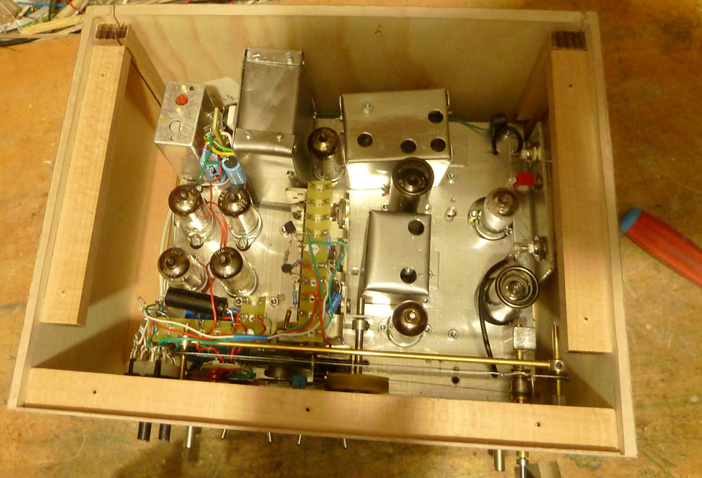 Momentan sind die Teile gebeizt und am Trocknen, morgen kommt dann der Lack drauf. Der Deckel muss noch etwas warten, da hier noch der Lautsprecher dran kommt, und der ist erst auf dem Weg. Wenn er dann hier ist, kann ich dieses Teil auch fertig machen. Weiter muss noch die Teleskopantenne montiert werden, die kommt voraussichtlich an das Plexiglas über die Abstimmung, so wird die interne Verbindung recht kurz.