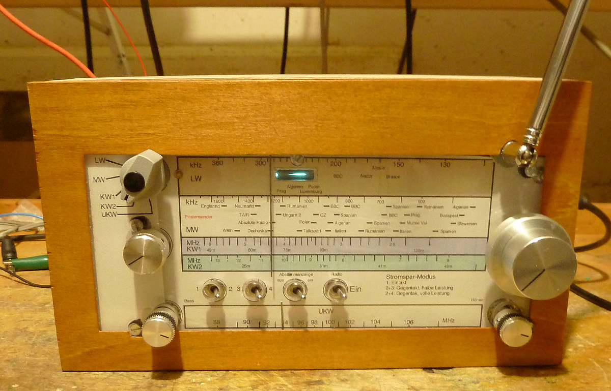 jetzt hat das Radio noch eine passend beschriftete Skala bekommen, hier provisorisch im Gehäuse eingebaut: