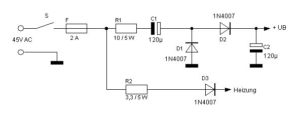 in der Verdopplerschaltung weden zwei Elkos mit je 120µF verwendet. Der Einschaltstromstoß übersteigt dabei den Auslösestrom der vorgeschalteten 2-Ampere-Sicherung. Das machen die beiden 1N4007 mit Sicherheit auf Dauer auch nicht mit. Der 10-Ohm-Vorwiderstand dämpft den Einschaltstrom auf einen erträglichen Wert.