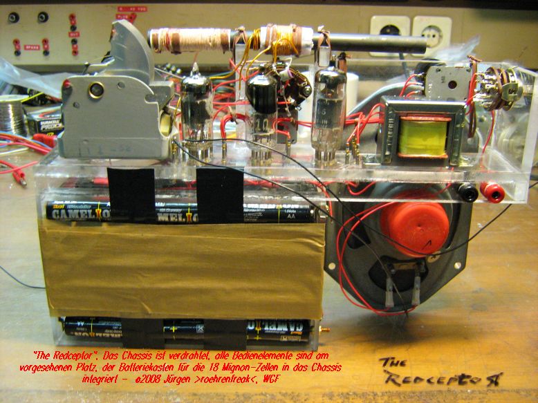 So ungefähr fing es bei mir vor rund sechs Wochen an in den Fingern zu kribbeln. Dann studierte ich auch noch Rainer´s "Black Receptor", eine wunderbar einfach nachzubauende Audionschaltung, die mich mit ihrer Leistungsfähigkeit ganz schön beeindruckt hat - Respekt, lieber Rainer, geht wirklich s..gut! Nun kam noch der Gedanke hinzu, das Radiochen auf Lautsprecherbetrieb "aufzubohren". Nach einigen Experimenten fiel die Wahl auf eine EC92 und eine EL95, welche auch bei einer niedrigen Anodenspannung überraschend gut funktionieren. Langsam aber sicher nahm das Projekt Form an und es wurden folgende Eckdaten festgeschrieben: - Äussere Abmessungen höchstens Kofferradio-Format - Voll Portable-tauglich - Autark ohne Netzanschluss - Mindestens fünf Stunden Dauerbetrieb - Mittelwelle, Kurzwelle ca. 5-11MHz, Langwelle optional - Anodenspannungsquelle aus billigen Mignon-Zellen, es wurden etwa 30Volt angesetzt - und für´s Auge: Ein rotes, transparentes Acryl-Gehäuse Nachdem die Schaltung als Drahtverhau ihre Funktionstüchtigkeit bewiesen hatte ging´s an den festen Aufbau. Nach einer Woche härtestem Schaffen war es denn soweit. Gestatten: Hier ist er