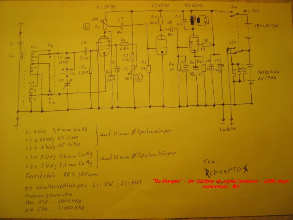 Hallo Röhrenfreak Allerliebst dein Redceptor. Ich meine man könnte noch jede Menge Heizstrom für die EL95 sparen wenn eine DL96 genommen wird. Es würde dabei auch ein 1,2 Volt Metalhydrid gut gehen. Der NF-Trafo würde wahrscheinlich auch gehen und 100 MW kannst du auch aus der DL96 an 30-40 Volt rausholen.