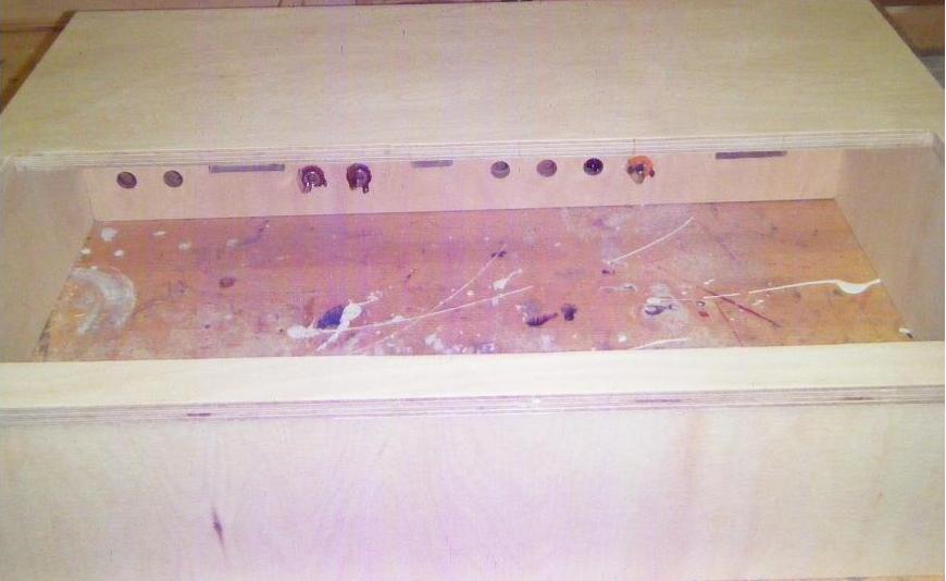 Hinter der Frontplatte wird ein schräges Gehäuse aufgebaut, welches die Zeigerinstrumente und die verschiedenen Kontrollampen aufnehmen soll. Hier ist ggf. auch noch Platz für weitere Platinen, da das Pult fast gefüllt ist und auf der Bodenplatte keine Platinen eingebaut werden, da für Umbauten oder Reperaturen die Bodenplatte einfach abnehmbar sein soll.