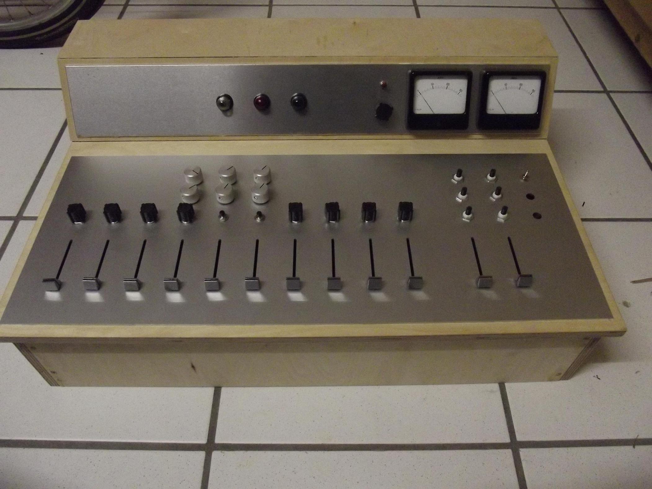 Mit vielen neuem Wissen, Messtechnik und Spaß an Technik ist ein neues Mischpult entstanden. Die beiden vorherigen Pulte mit selbstgefräster Frontplatte sind teilweise geschlachtet worden (Material Gewinnung, Flachbahnregler o.ä.) oder werden irgendwann verbessert.