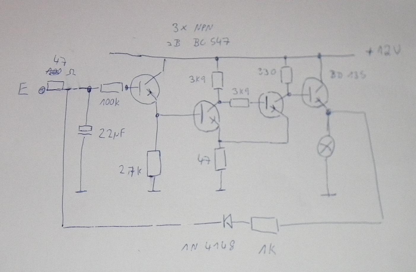 Hallo nochmal, du hast oben geschrieben, dass du R3 470kOhm gegen 470Ohm getauscht hast. Das ist arg wenig und könnte je nach Typ den Q2 gefährden. (ca. 25mA Basisstrom bei 12 V!) Da wären 4,7k bis 47k gut geeignet. Der Autor der ursprünglichen LED-Schaltung wollte mit dem hohen Wert von 470k vermutlich erreichen, dass die LED nicht auch bei "aus" noch schwach leuchtet. 470kOhm setzen aber eine gute Stromverstärkung von Q2 voraus.
