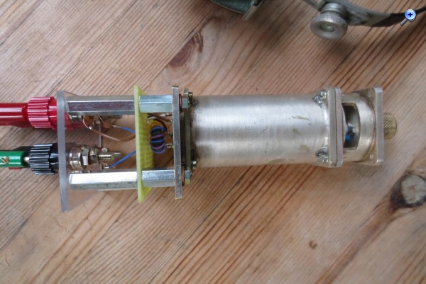 Der bewährte Phasendiskriminator aus der Schaltung von R.W. wurde identisch aufgebaut und die Windungszahlen der Ein- und Auskopplung, bedingt durch den kleineren Durchmesser, experimentell neu ermittelt. Drei mal musste ich die Windungszahl anpassen. Nun habe ich das optimale Ergebnis mit je 2,7W gefunden und konnte mit einem offenen Dipol zwei Stationen im Garten (2m über Grund) an der Hörschwelle empfangen. Entfernung 16km zum Sendemast. Das kleine nur 100mm lange und 40mm dicke Rohr schafft zwar nicht die Ergebnisse meines Großprojekts, kommt aber so ca. 2/3 an dessen Empfangsleistung ran. Das versilberte Rohr ist komplett geschlossen. Die Leitungsdurchführungen am Boden sind Glasdurchführungen.