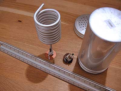 in meinem UKW- Resonatorprojekt hatte ich auf Seite 41 auf einen versilberten Minniwendelkreis aus russischer Militärtechnik hingewiesen. Dieser schien für einen Taschendetektor mit hoher Güte (>1000) wie geschaffen. Das ließ mir keine Ruhe und ich wollte unbedingt ein Vergleich zum großen Kupferkasten wagen. Der Kreis ist ja schon abgestimmt als Geschenk in meinen Fundus gekommen und es musste ja nur noch eine Ein- und Auskopplung gebastelt werden.