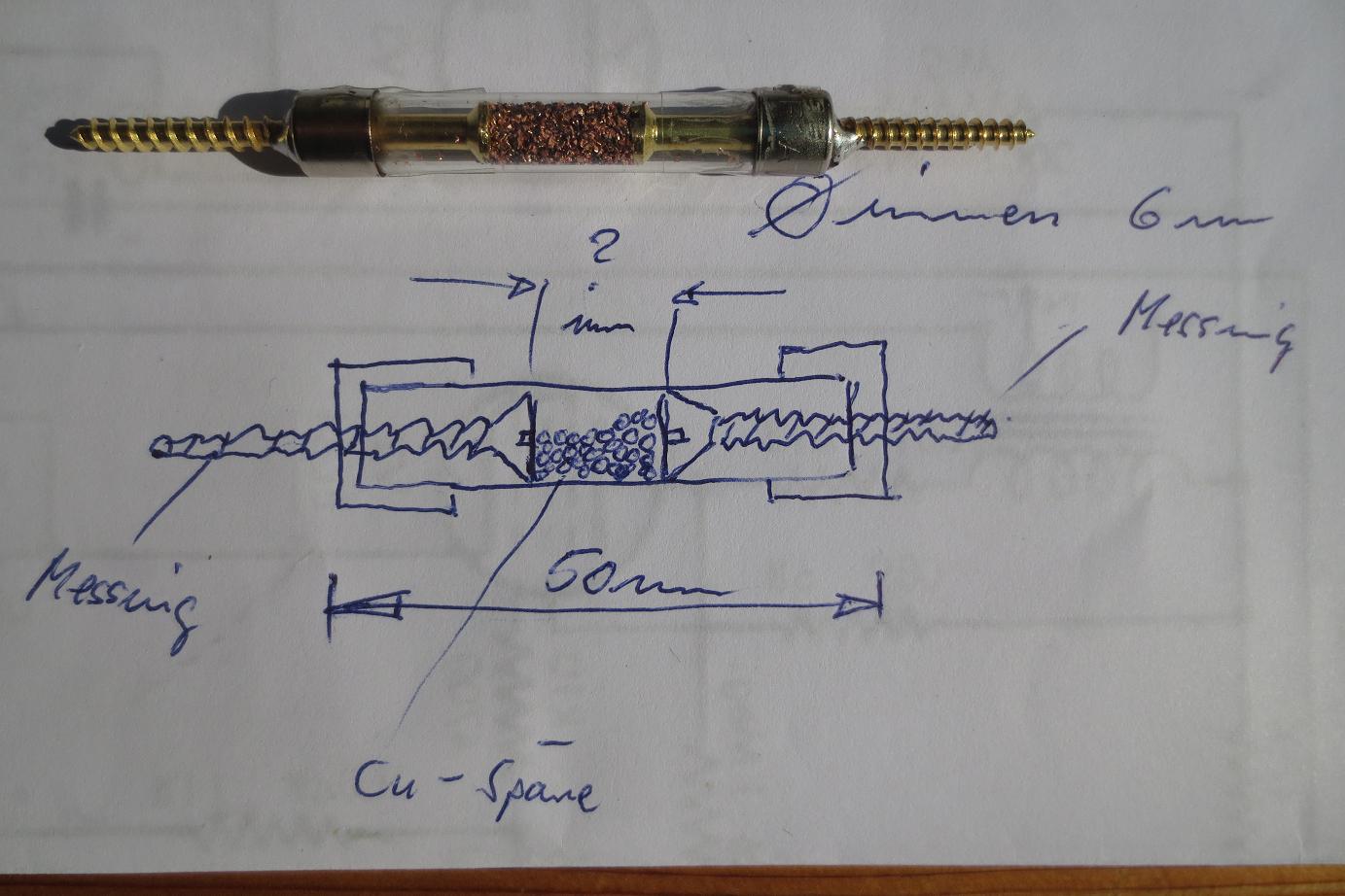 Mein Fritter ist aus einer alten 50mm 315mA Feinsicherung gebastelt. Die Kontakte müssen sehr stark mit dem Lötkolben erhitzt werden, dann löst sich der Kleber und die Sicherung kann ausgeräumt werden. Als Elektroden dienen Messingschrauben, deren Köpfe auf 6mm abgeschliffen wurden. Den Abstand der Elektroden wählte ich beim ersten Versuch auf 3mm. Es ergab sich aber keine hochohmige Strecke im Glaskolben, da meine eingefüllten Kupferspäne sehr grob sind.