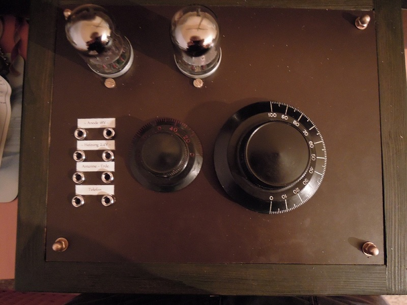 Die Röhre im KW Audion ist nicht durch. Ich habe den Übertrager weggelassen, um direkt einen hochohmigen Kopfhörer anzuschließen. Bei jenem war allerdings ein Kabel gebrochen, so dass es nicht funktionieren konnte. Habs mit einem Hagenuk 2000Ohm Hörer probiert und es funktioniert! An der Rahmenantenne hab ich gegen 16.00 Uhr auf Anhieb eine russische Station empfangen. Heute habe ich gleich mal den Rabatt im örtl. Baumarkt genutzt und 40 Meter Litze gekauft. Diese habe ich U-förmig im Garten in gut 3 Meter höhe gespannt. Als Erde habe ich ein in die Erde geschlagenes, 30cm Kupferrohr mit angelötetem Kabel verwendet. Gegen 18.00 habe ich heute sehr viele Stationen empfngen. Französische, Russische und sogar eine Asiatische.