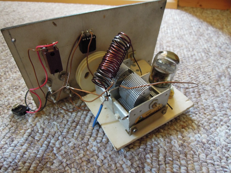 Die 2mA Anodenstrom sind aber auch vom eingesetzten Übertrager abhängig. Da die Schaltung keinen Anodenwiderstand hat, übernimmt die Primärwicklung des Übertragers diese Funktion. Auch hier könnte ein Problem bestehen, wenn die Primärwicklung durchgebrannt ist. Mess mal den Ohmschen Widerstand durch. Auf Deinem Bild kann ich den Übertrager nicht sehen....es sieht aus als ob er nicht vorhanden wäre. Die KW- Spule sollte zwar kurz am Drehko angelötet sein...aber nicht unbedingt beim Drehen vom Plattenpaket berührt werden.