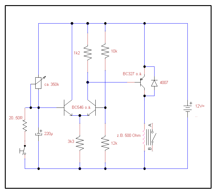 Nein, so eine Schaltung meinte ich nicht. Ich habe nur einen Kondensator, einen Widerstand und ein Relais benutzt, keine Transistoren oder ähnliches.