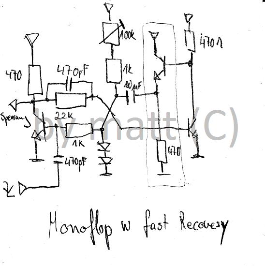 Kleines Hinweis: Widerstand und Transistor in Kästchen beschleudigt Erholungszeit bis zu 1000fach schneller als Standard Transistor Monoflop. Eine Eigenentwicklung von mir, kräftige Transistor mit wenige Verstärkung ist eine Pflicht sonst wird Transistor dank hohe Strom sterben, mir ist nicht passiert.