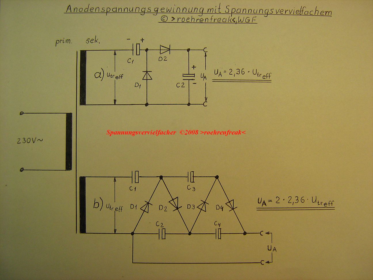 ergänzend erlaube ich mir noch die folgende Alternativmöglichkeit zur Anodenspannungs-Erzeugung vorzustellen. In manchen Steckernetzgeräten ist ein Trafo mit Ausgangsleerlaufspannungen von z.B 18, 24 oder gar 30Volt zu finden. Hier könnte es zweckmässig sein, mit einer Spannungsvervielfacher-Schaltung auf die gewünschte Ausgangs-Gleichspannung zu kommen. Das Beispiel a) im Bildanhang zeigt eine einfache Verdopplerschaltung, Beispiel b) einen Vervierfacher. Letzter kann mit weiteren geradzahligen Dioden und Kondensatoren beinahe beliebig erweitert werden, so daß sich die Ausgangsspannung pro "Stufe" um 2,36*U Tr eff.* erhöht. Die Schaltung wird auch als "Kaskade" bezeichnet.