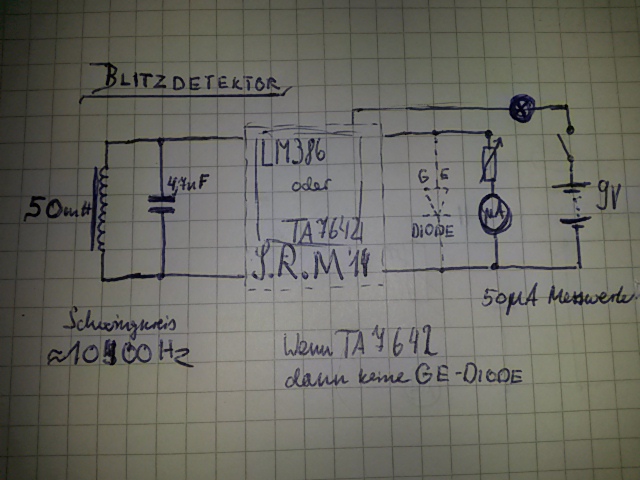 ich habe mal wieder eine Idee Im Moment habe ich zwar zwei Sachen noch am bearbeiten, aber so habe ich immer was zu basteln. Ich brauch mal wieder ein selbstgebautes Erfolgserlebnis. Jetzt geht ja die Gewittersaison los. Da dachte ich mir, das muss sich ja auch irgendwie detektieren lassen. So wie ich jetzt herausgefunden habe, sollen Frequenzen um 10kHz zum Blitzdetektieren ideal sein. Ein reiner Detektor mit GE Diode und Ferritantenne wird zu unempfindlich sein. So wollte ich auf den Radio IC TA7642 zurückgreifen. Allerdings bin ich mir nicht sicher, ob man damit noch was um 10kHz empfangen kann. Auf Burkhard Kainkas Seite kann man nachlesen, dass dieser IC um 500kHz die größte Empfindlichkeit hat. Also eher nicht so Ideal. 10000Hz sind ja noch hörbar und so dachte ich mir, dass man ja vielleicht auch einen LM386 mit anschließender GE Diode zum Gleichrichten nehmen könnte. Ist das theoretisch möglich? Zum anzeigen würde ich ein kleines uA Meter nehmen, welches dann zuckt, wenn es Blitzt. Da habe ich ein schönes mit einem Messbereich von -50uA bis +50uA da. Ein Poti davor wird dazu da sein, das ganze auf null zu stellen. Seht selbst: