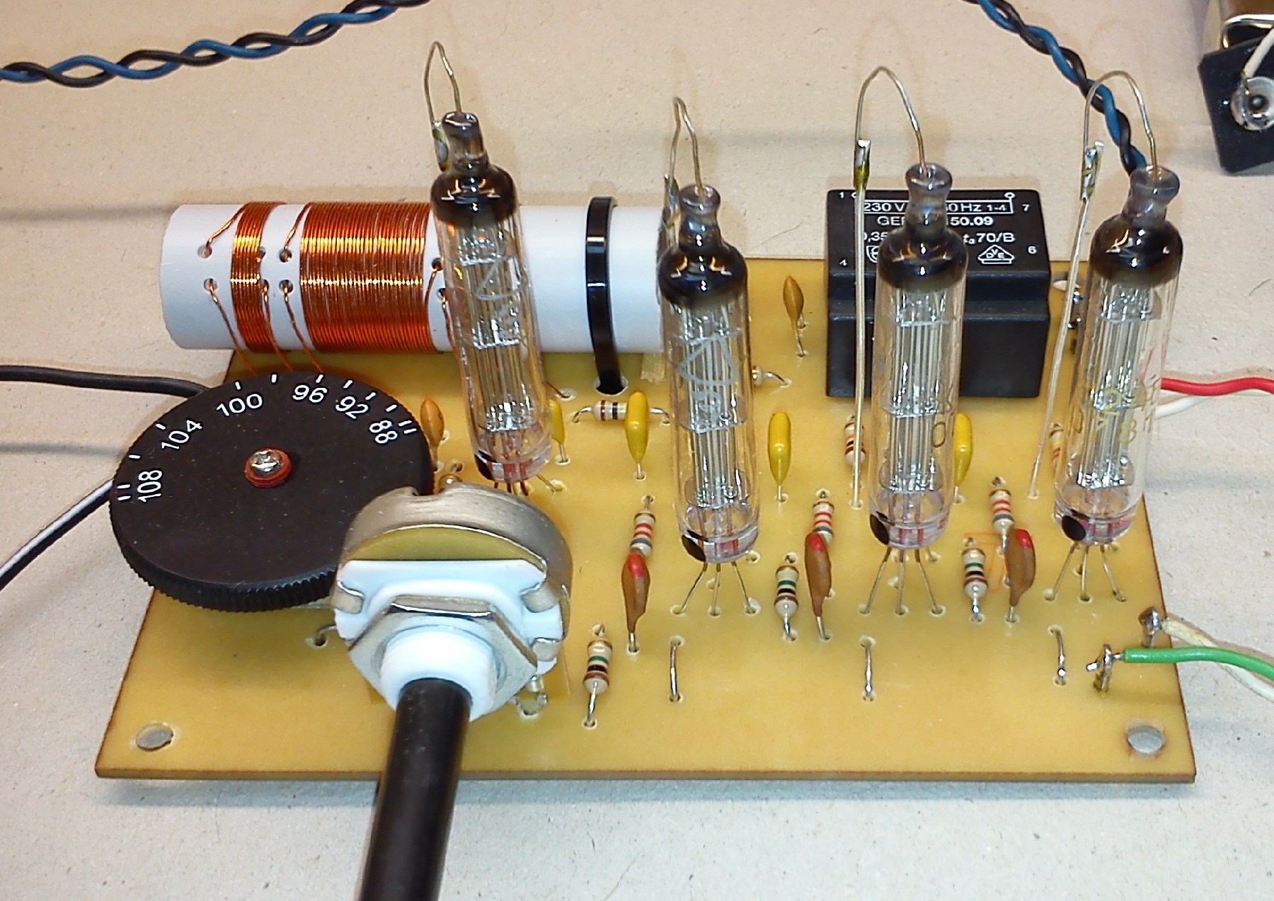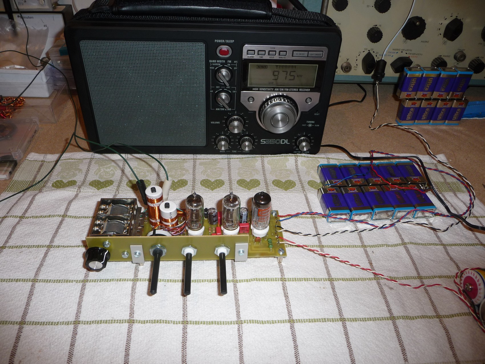 Nach dem Bau nun der erste Testlauf. Die Heizspannung ist 2,4 Volt. Die Anodenspannung soll zwischen 45 und 90 Volt liegen. Das Radio funktionierte auf Anhieb. Mit 72 Volt geht es schon ordentlich zur Sache. Auf allen Wellenbereichen kann ich abends mit etwa 15 Meter Draht unter dem Dach sehr viele Sender mit ordentlicher Zimmerlautstärke empfangen. Stellenweise muss man sogar leiser drehen. Als Lautsprecher diente erstmal ein frei hingelegter Ovallautsprecher aus einem Sperrmüll-TV. An einer HiFi Box gibt es sogar sowas ähnliches wie Bass und die Wiedergabe ist insgesamt auch noch lauter.