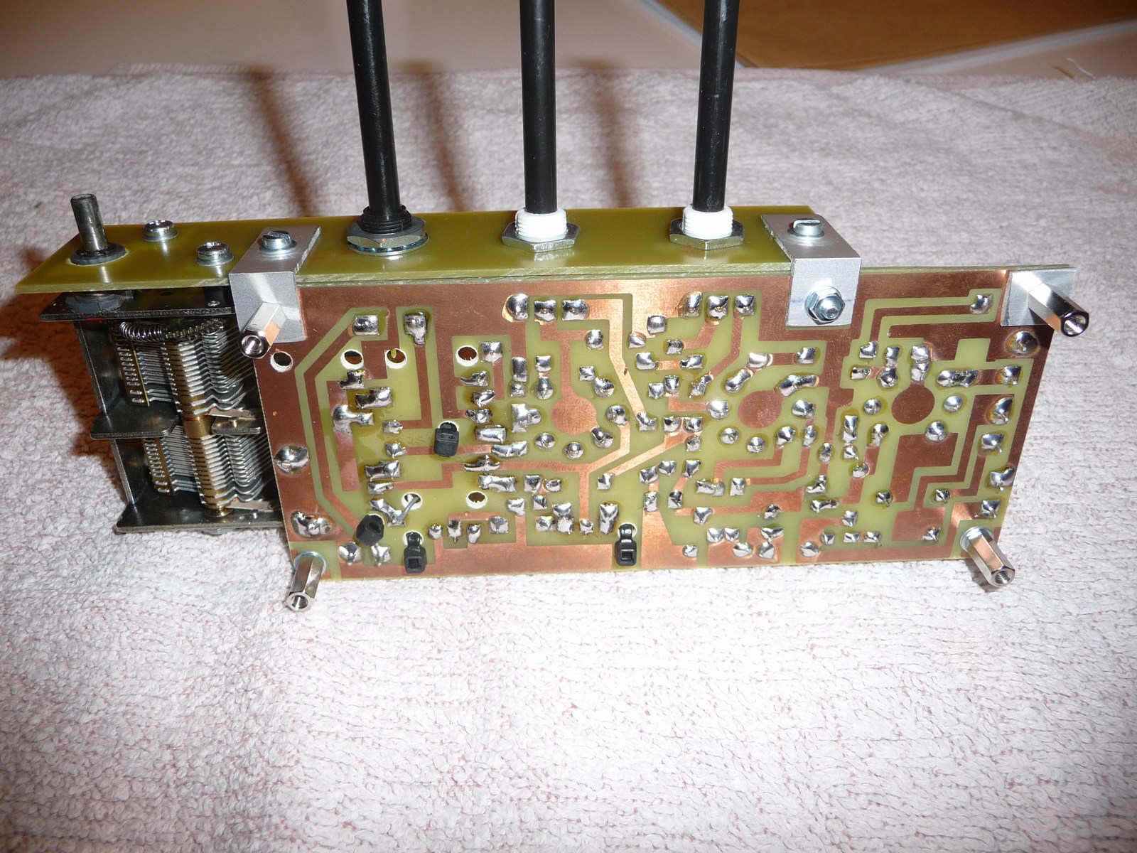 Entgegen der Anleitung habe ich alle Bedienelemente auf die Bedienplatine geschraubt, nicht nur den Dreko und den Wellenschalter. Vorgesehen war es so, das die Potis für Lautstärke und Rückkopplung nur auf auf die Platine gelötet und die Wellen durch die Löcher der Bedienplatine geführt wurden. Das war wackelig, auch wenn die Wellen später noch durch Gehäusebohrungen gehalten werden könnten.