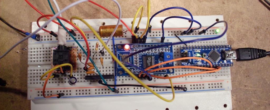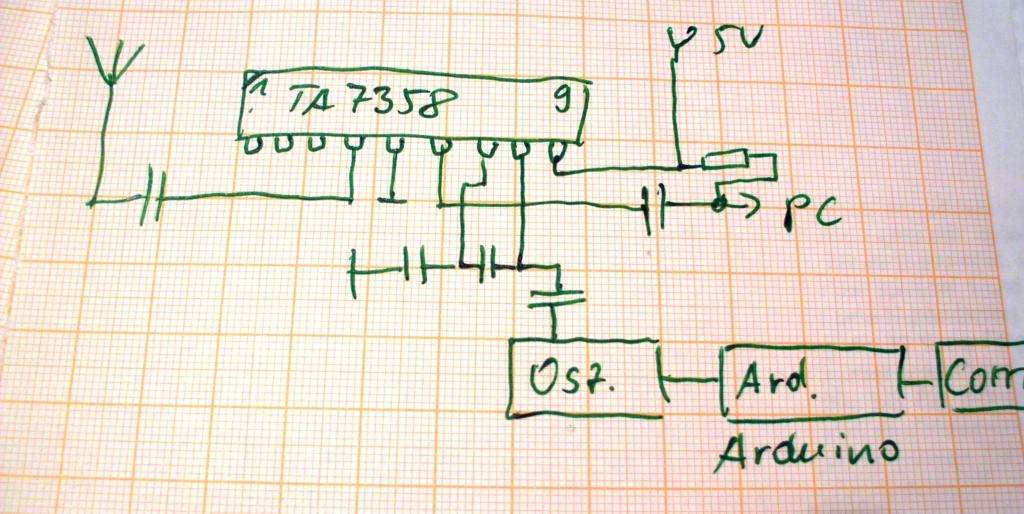 Der Empfängerschaltkreis ist ein TA7358 gefolgt vom programmierbaren Oszillator und dem Arduino. Die Frequenz wird über eine serielle Konsole zum Arduino übertragen der dann den Oszillator auf die Frequenz stellt.