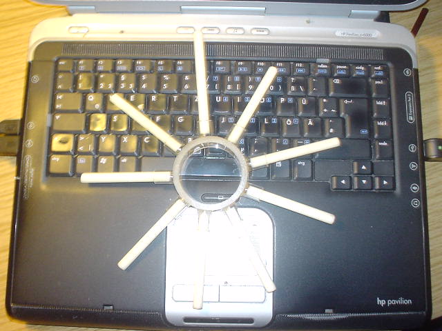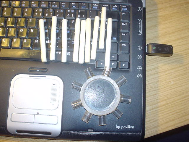 Von einem Plexiglas oder anderem Rohr mit rd. 4-6cm Durchmesser wird ein ca.2,5cm breites Stück abgesägt,auf das dann 9 etwa 1,5cm kurze Röhrchen augeklebt werden so daß die Zwischenräume zwischen den Röhrchen etwa den gleichen Abstand haben.