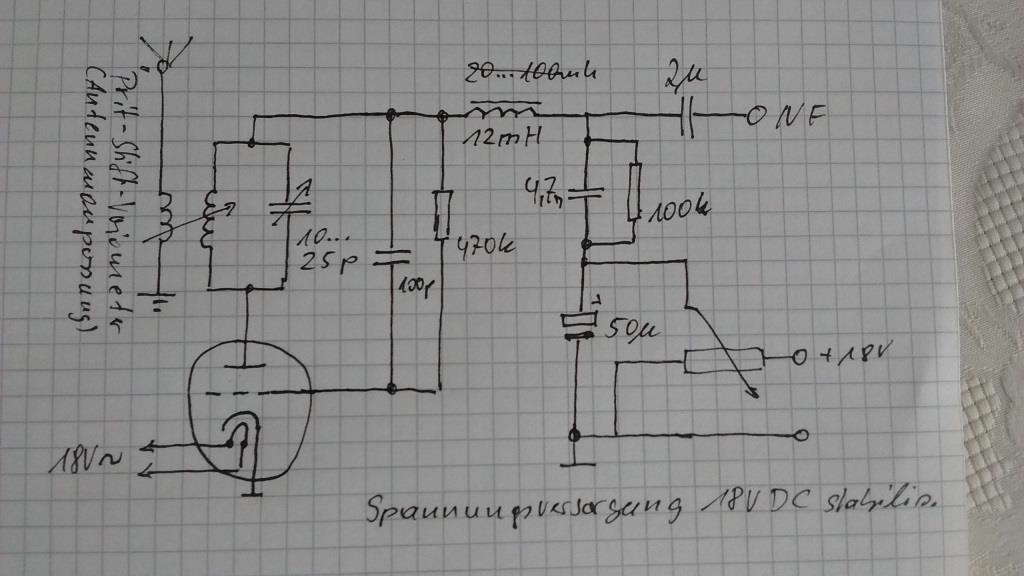 Seit langem bin ich wieder mal zum Basteln gekommen......Ergebnis ist ein Pendelempfänger für das 40m/41m Band. Den Empfänger habe ich mit der Triode aufgebaut, die Pentode soll als NF Verstärker den Lautsprecher ansteuern (wenn alles klappt). Der Empfänger läuft ausgezeichnet mit einer Spannung von 18V. Da ich ein 18V AC / 1A Steckernetzteil verwenden will, denke ich über eine Spannungsverdopplung ein- oder zweistufig für die Anodenspannung der Pentode nach.