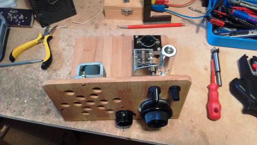 da ich mit meinen Experimenten zur Kaskode-Audion recht erfolgreich war, (die Schaltung ist echt der Hammer), habe ich mir überlegt das Audion als "festen" Empfänger aufzubauen. Der mechanische Aufbau des Empfängerteils steht. Die Anodenspannung soll wieder bei 12 V liegen, wobei ich mir noch etwas unschlüssig bin. Ebenso bei meiner NF, aber das wird sich zeigen.