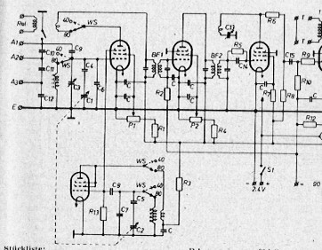 vielen Dank für die Anerkennungen. @Wolfgang, ja das Lochblech ist für solche Anwendungen ideal, leicht zu bearbeiten und wirkungsvoll. Der Frequenzzähler ist einer dieser preiswerten Module aus China. Die 2.Stelle hinter dem Komma (10Hz) habe ich abgedeckt weil sie zu oft flackert und damit nervt. @joerg, den AM-Schwund sehe ich im Moment nicht so dramatisch, noch gibt es viel zu hören. Das endgültige Aus erlebe ich während meiner Bastlerlaufbahn sicher nicht mehr In der Modulbauweise sehe ich für mich als Nichtexperten den großen Vorteil, dass man eine funktionierende Stufe an die andere reihen und in Betrieb nehmen kann. Sinnvoller Weise fängt man mit der Stromversorgung an und arbeitet sich nach vorne. Diese Aufbaureihenfolge halte ich auch bei Geräten mit klassischem Chassisaufbau ein. Das grenzt die mögliche Fehlersuche später stark ein. Der Stromlaufplan fehlt natürlich. Allerdings habe ich bis jetzt die Arbeit gescheut, diesen mit dem PC zu zeichnen. Deshalb kommt hier ein Scan mit Ausschnitt des Prinzipschaltplans ohne Bauteilewerte. Bis auf den NF-Teil und Änderungen im Audion ist die Schaltung praktisch identisch. Falls sich jemand für die Bauteilewerte interessiert, bitte melden.