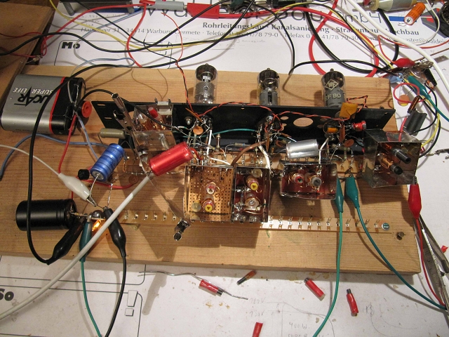 die HF-Problematik ist natürlich zu beachten und ich hab da auch viel "Lehrgeld"=Zeit dafür bezahlt. Eine wichtige Erkenntnis war zB., daß es neben kapaz auch induktive Verkopplungen über Leiterschleifen geben kann, die dann niederohmig kopplen und Abschirmungen helfen da fast garnicht mehr. Hier mal der erste Versuch eines B-ZF-Verstärkeraufbaus mit 3xEF80: