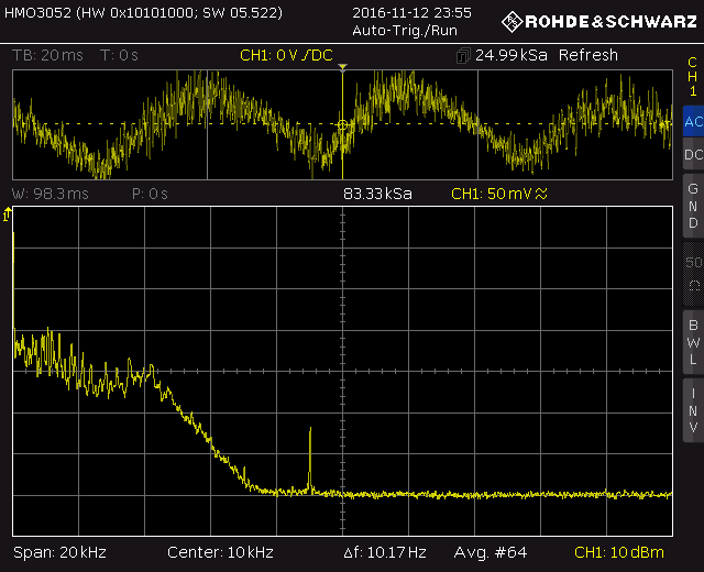 Hier noch das Spektrum am NF-Ausgang, empfangen wurde ein schwacher Gleichwellensender. Im Zeitbereich (oberer Teil) sieht man die 5Hz-Schwebung der beiden Gleichwellensender, die etwa gleich stark ankamen. Im Spektrum sieht man das NF-Signal vom Sender mit 4.5kHz-Bandbreite, danach Restsignale, weil das Bandfilter noch etwas zu breit ist, und bei 8kHz ist schon sehr dicht. Der schwache Peak bei 9kHz ist einer der beiden Nachbar-Träger.