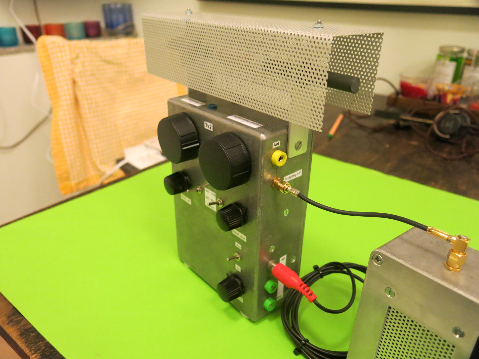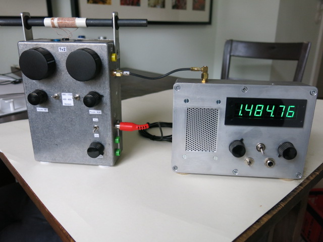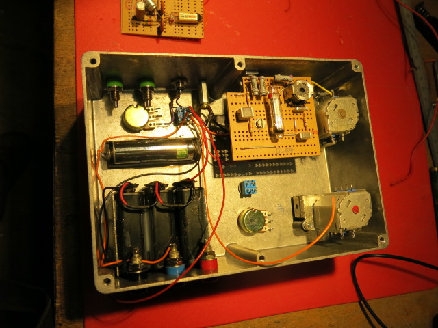 Um das Ganze abzurunden habe ich für das Gerätchen ein Luxuszubehör gebaut. In einer weiteren Alubox befinden sich das Frequenzdisplay und eine 1 Watt-IC-Endstufe. Das Ganze wird über eine 9Volt Batterie versorgt. Damit ist ein recht komfortabler Empfang möglich.