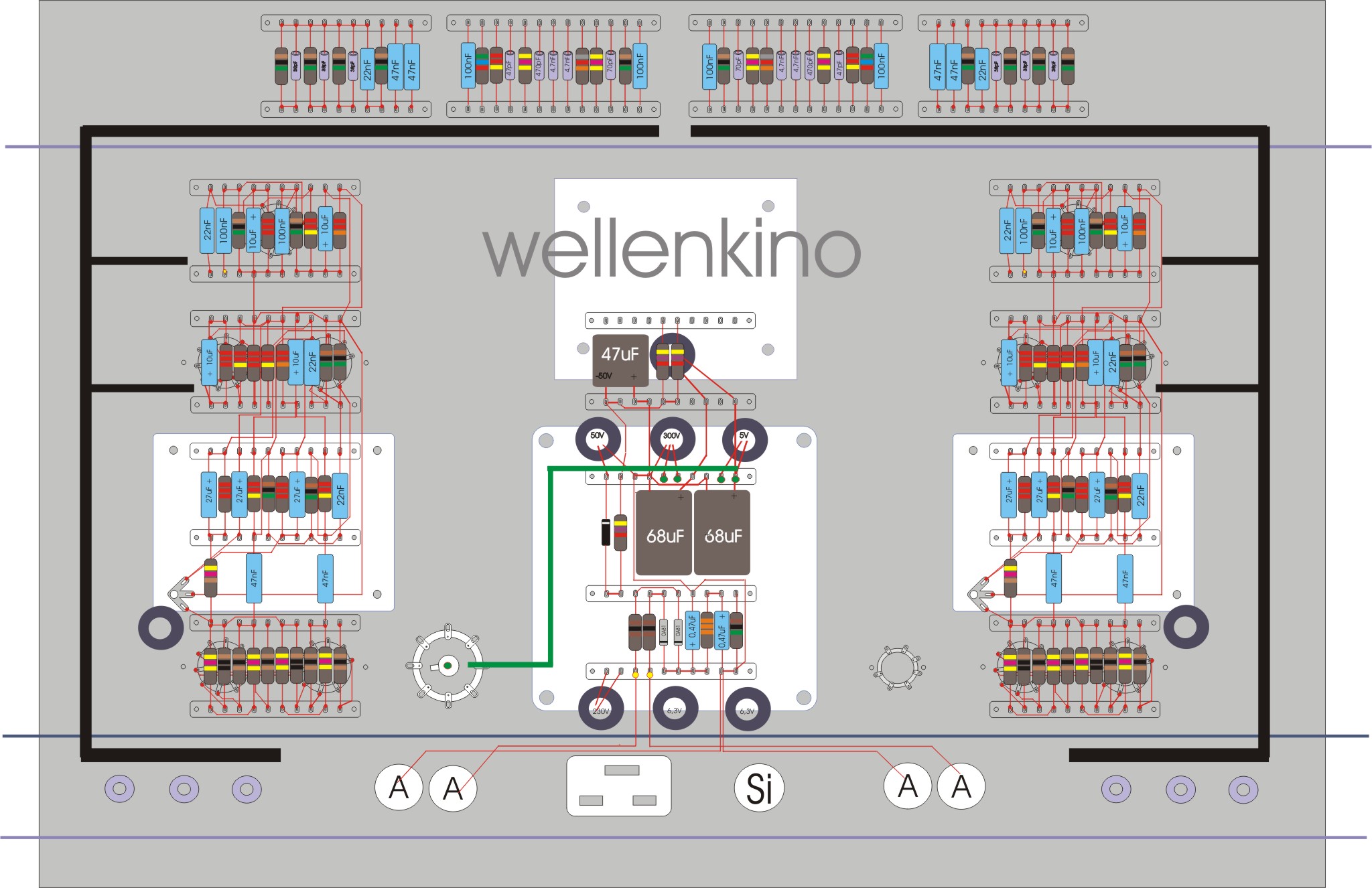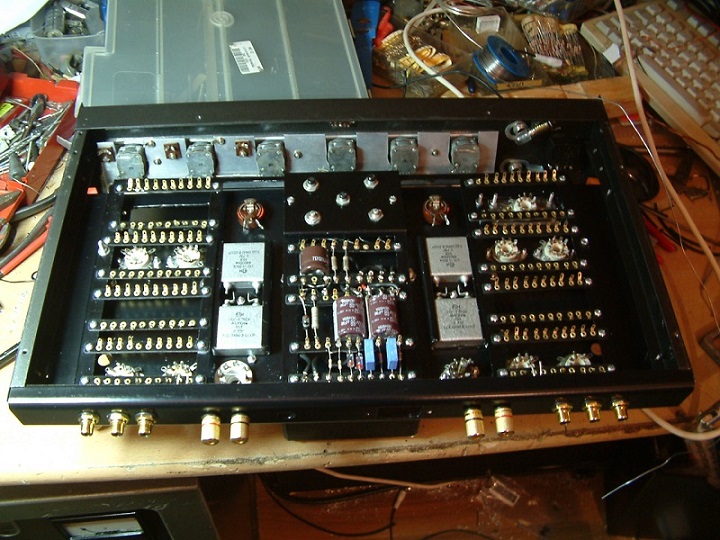 Bauart: Lötleistendesign, mit Kabelbaum und Knötchen. optimierte Leitungsführung, sowenig und so kurz wie möglich, strenge räumliche Trennung von Signalkabeln und Wechselspannungen empfindliche Teile sollen abgeschirmt sein Anordnung von Transformatoren so daß möglichst geringe / keine magnetische Kopplung untereinander erfolgt Alle Bauteile in Reih und Glied ! Getrennter Aufbau der beiden Kanäle und der Versorgung Selbstgemachte Lötleisten aus Epoxy, genietet. Trägerrahmen innen (wenig Schrauben im Chassis) zeitgemäße Anschlußbuchsen. neues Chassis anfertigen. Designvorgabe: ein richtiger Imperator ist schwarz !