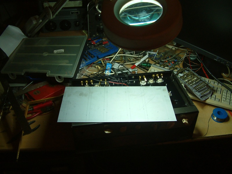 Die Buchsen sind aus der Bucht, die Lautsprecherbuchsen aus China importiert. Chassis, Blechtteile, Lötleisten etc. alles selbstgemacht, entsprechend groß ist der Bastelspaß. Die Planung vom Aufbau war eine Herausforderung, 12 Röhren bei einer Bautiefe von 20cm bis zur Trennwand, das ist schon etwas eng.