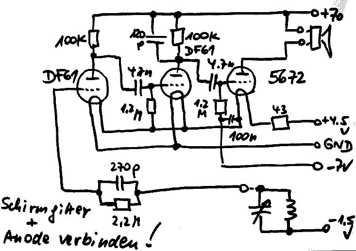 ich kann aus 200km Entfernung den Sender Wawre auf 621 kHz auch ohne Rückkopplung stabil und fast ohne Rauschen mit dem OE333 Nachbau hören. Morgen werde ich deinen Vorschlag ausprobieren und berichten, ob es einen Empfindlichkeitszuwachs gibt und z.B. der schwach aber stabil einfallende Sender Charleroi ankommt, den ich sogar mit dem Chelsea (UV-200) plus 2-step-amp (UX-201A) einfangen kann.